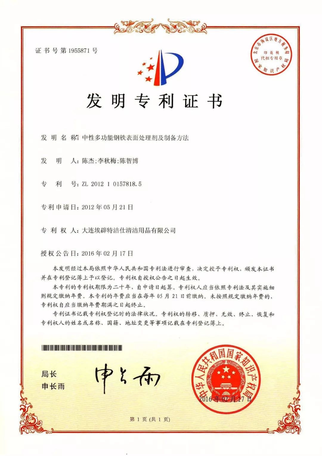 天道酬勤,潔仕榮譽室內,一排排專利證書和獎杯獎牌是對潔仕人24年堅持技術創(chuàng)新最好的肯定。目前,潔仕公司擁有國家授權的發(fā)明專利3項,發(fā)明專利申請6項,實用新型專利申請15項,應邀參與了2項國家標準的制訂,主導了2項行業(yè)標準的制定,獲得部級科研成果三等獎1項,在專利技術水平、專利技術儲備、產品轉化率及市場占有率等方面,均處于業(yè)內領先水平。就在幾天前,潔仕公司通過了國家知識產權局的嚴格評審,被評選為“2018年度國家知識產權優(yōu)勢企業(yè)”,是全國1134家通過評審的企業(yè)中唯一一家商用清潔劑領域的企業(yè)。